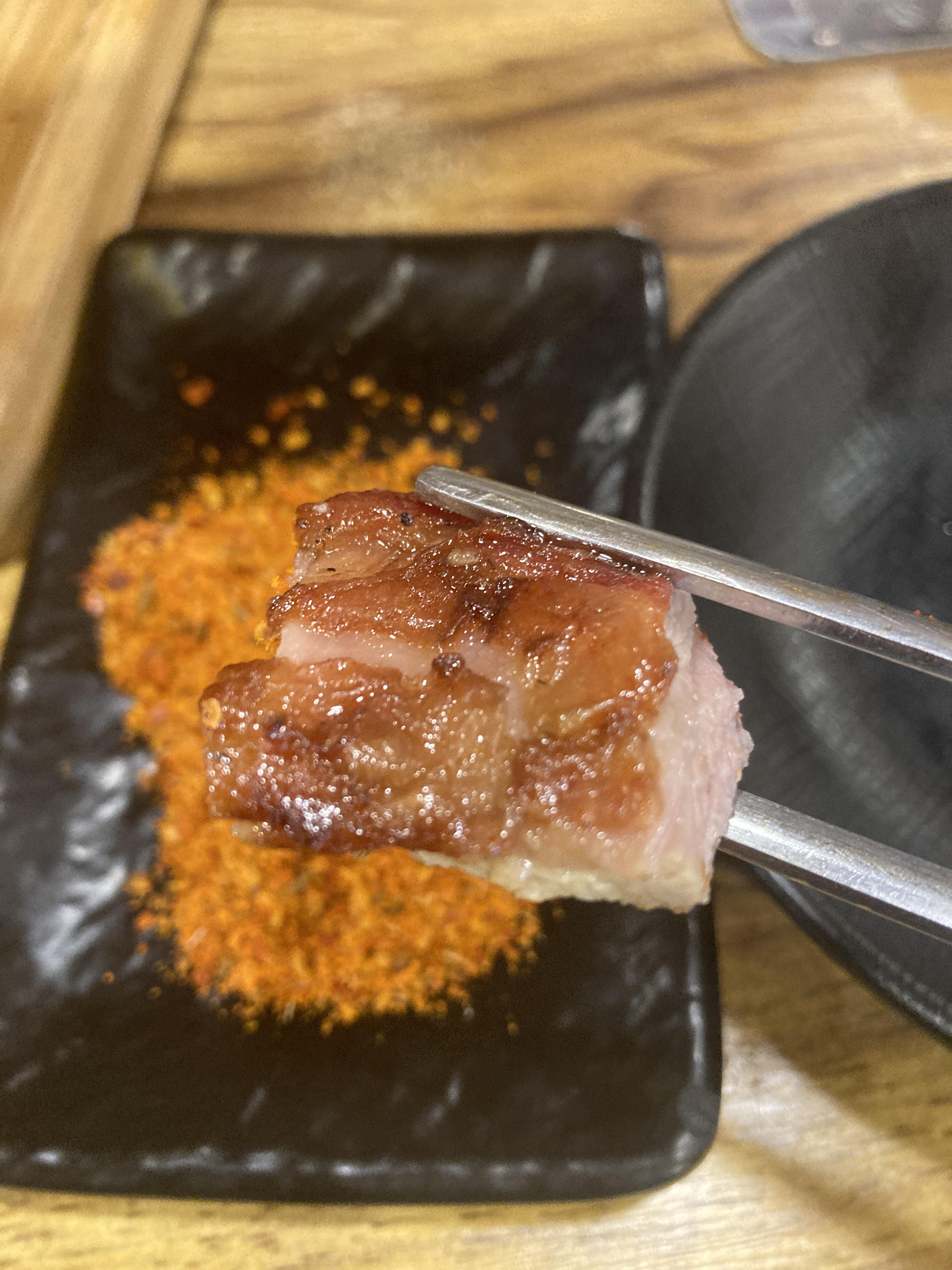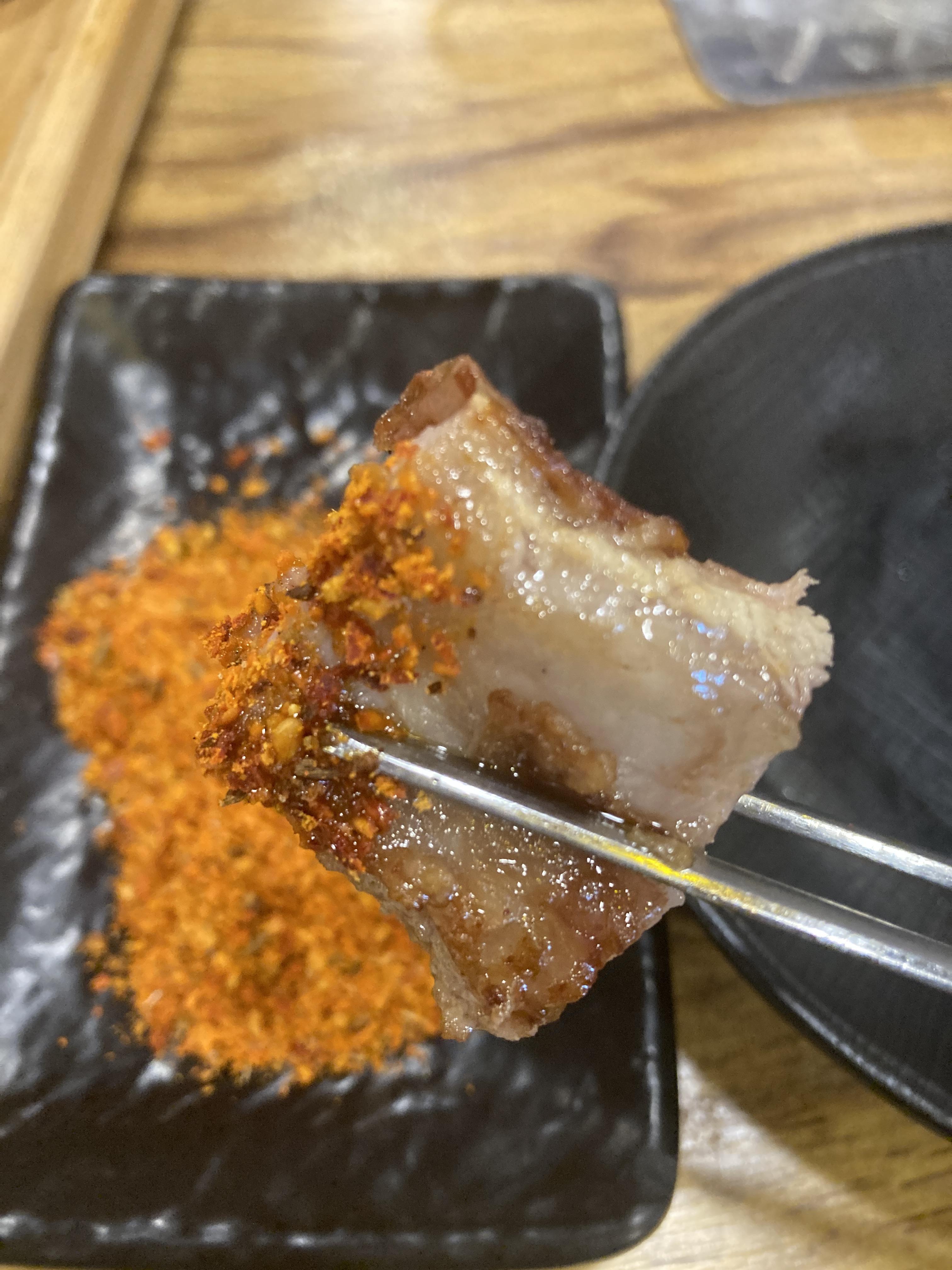 통양갈비는 쫄깃한 갈비부위의 식감을 가지고 있으며 그냥 먹으면 양갈비의 고소한 맛과 느끼한 맛을 같이 즐길 수 있으며, 쯔란 가루에 찍어먹으면 간도 적당하고 향도 좋아 입에 착착 달라붙습니다.