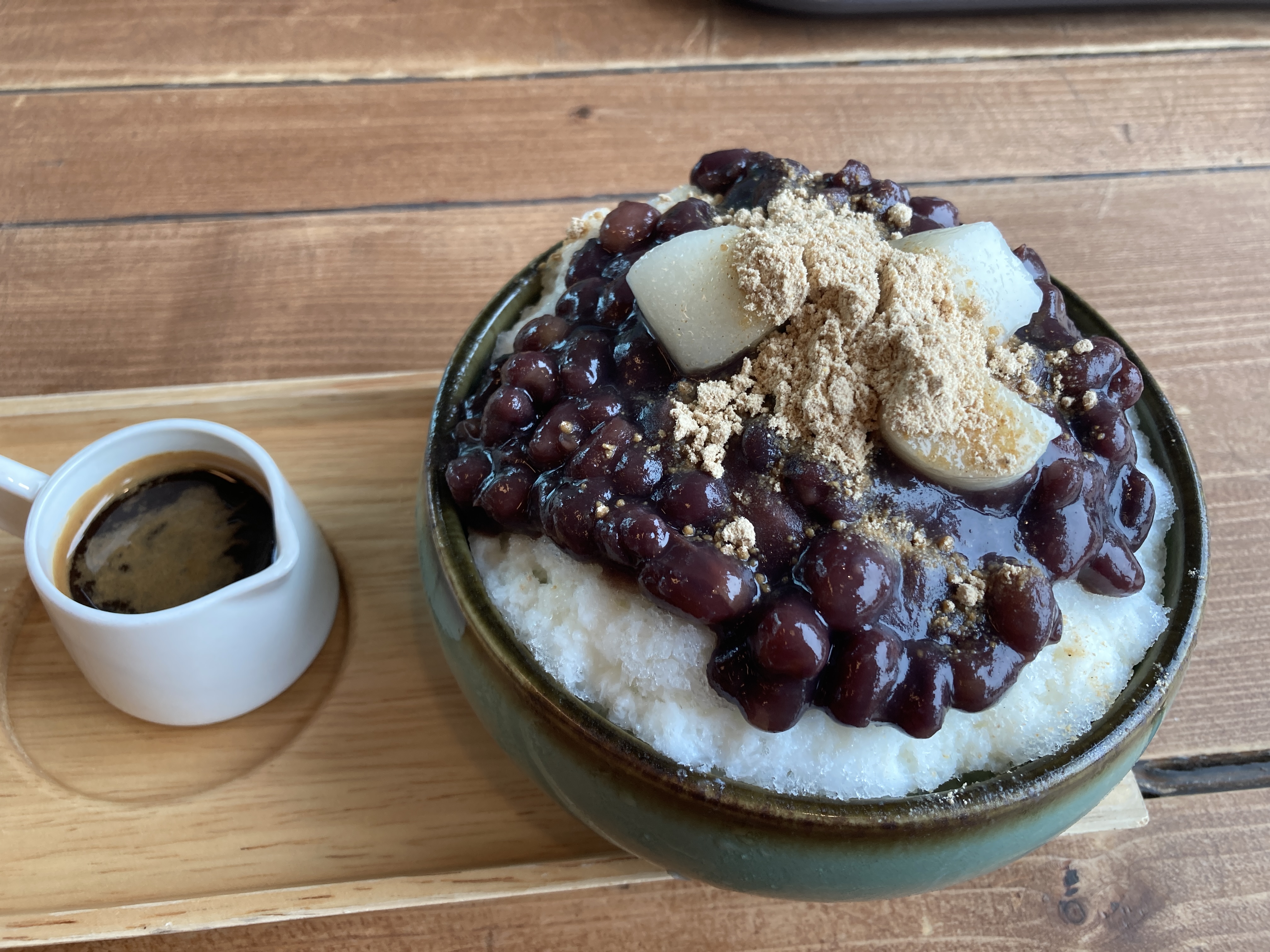우유 베이스의 얼음에 단팥과 인절미, 콩가루로 마무리한 옛날 방식의 팥빙수입니다.