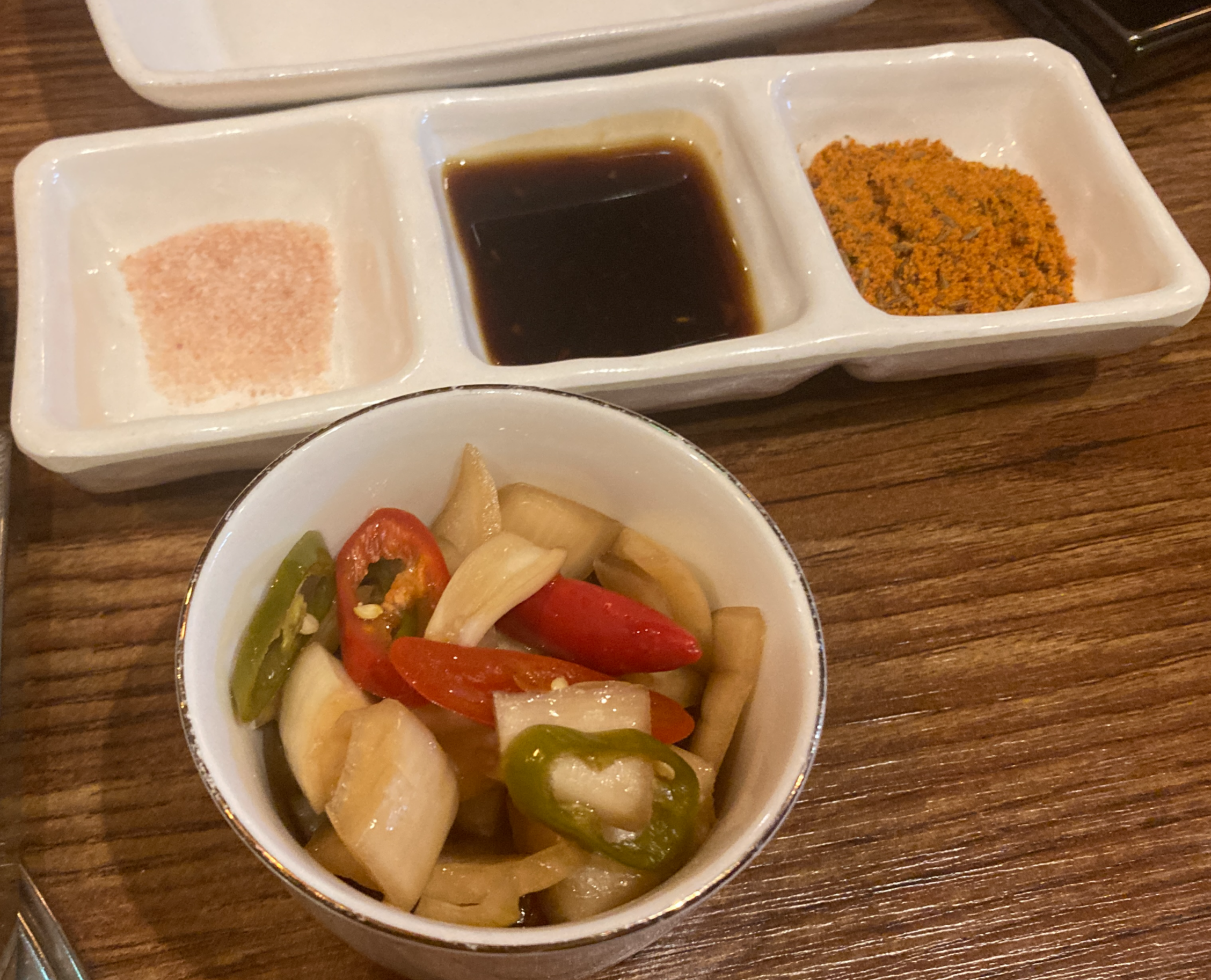 밑반찬은 고기과 곁들여 먹는 숙주나물과 또띠아가 눈에 띄며 짜사이와 양파절임이 나왔습니다.