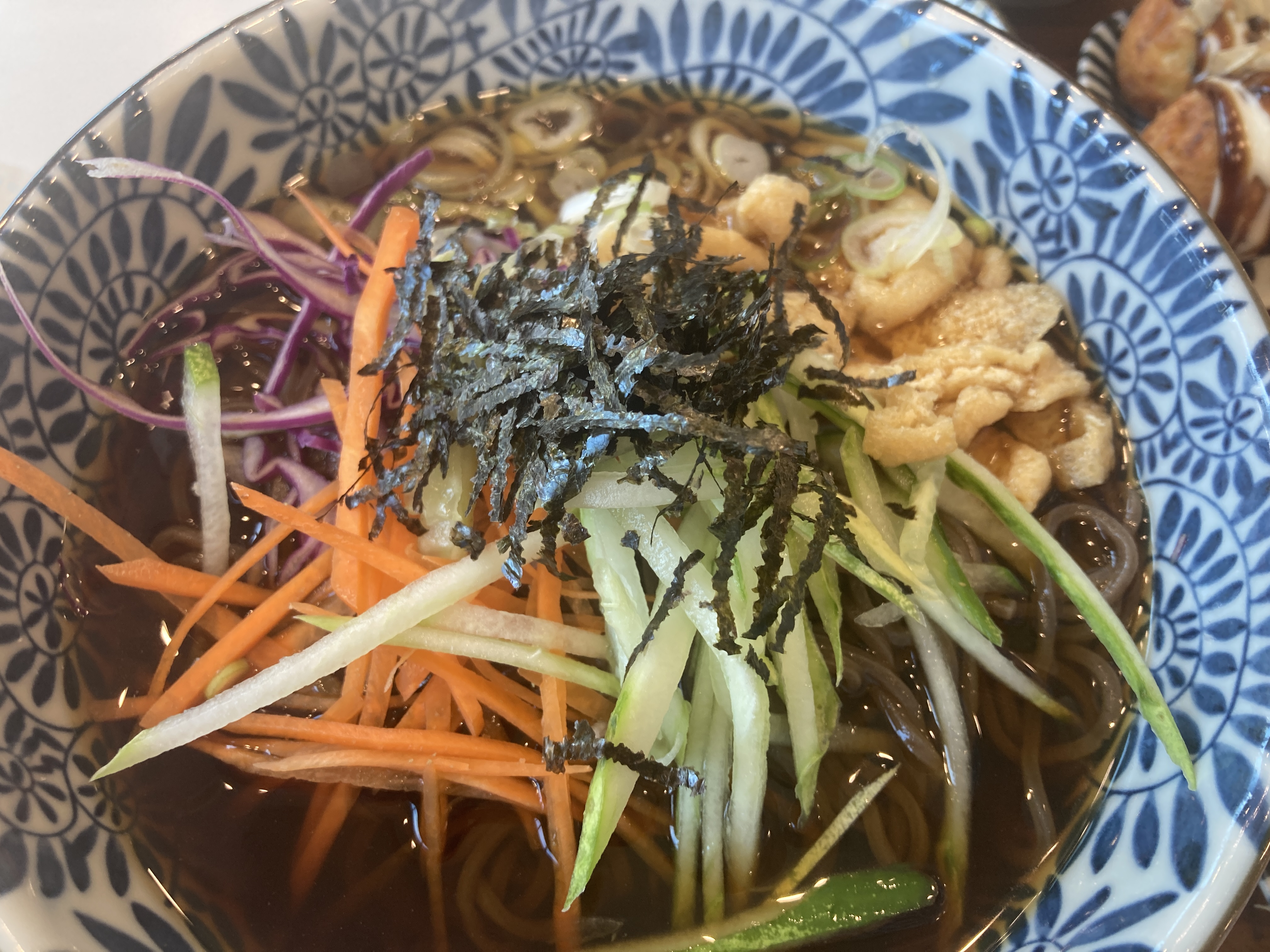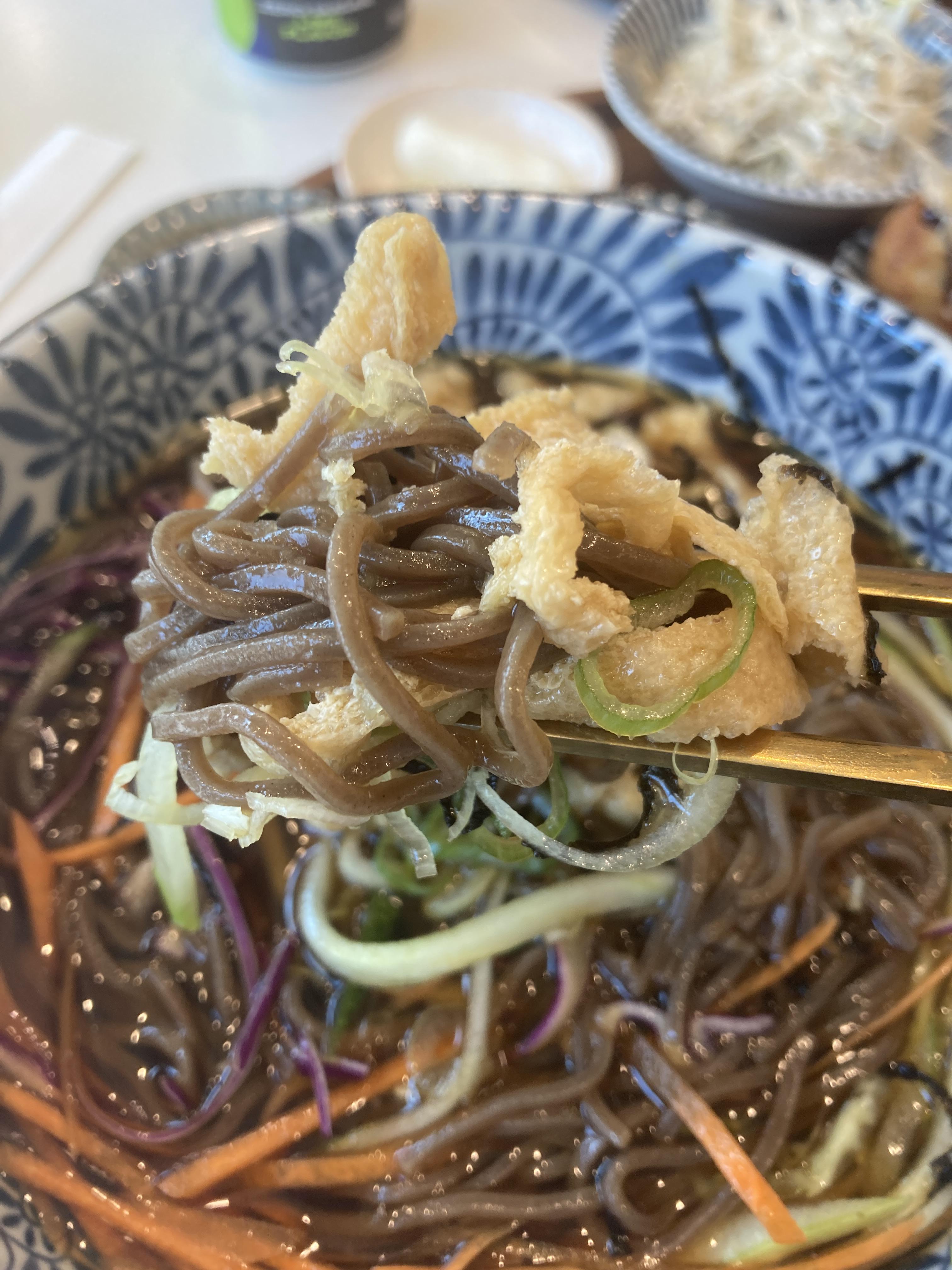 냉소바는 유부와 야채토핑이 많아 아삭한 식감이 좋았고 모밀면의 쫄깃한 식감과 육수의 감칠맛 또한 맛있었습니다.