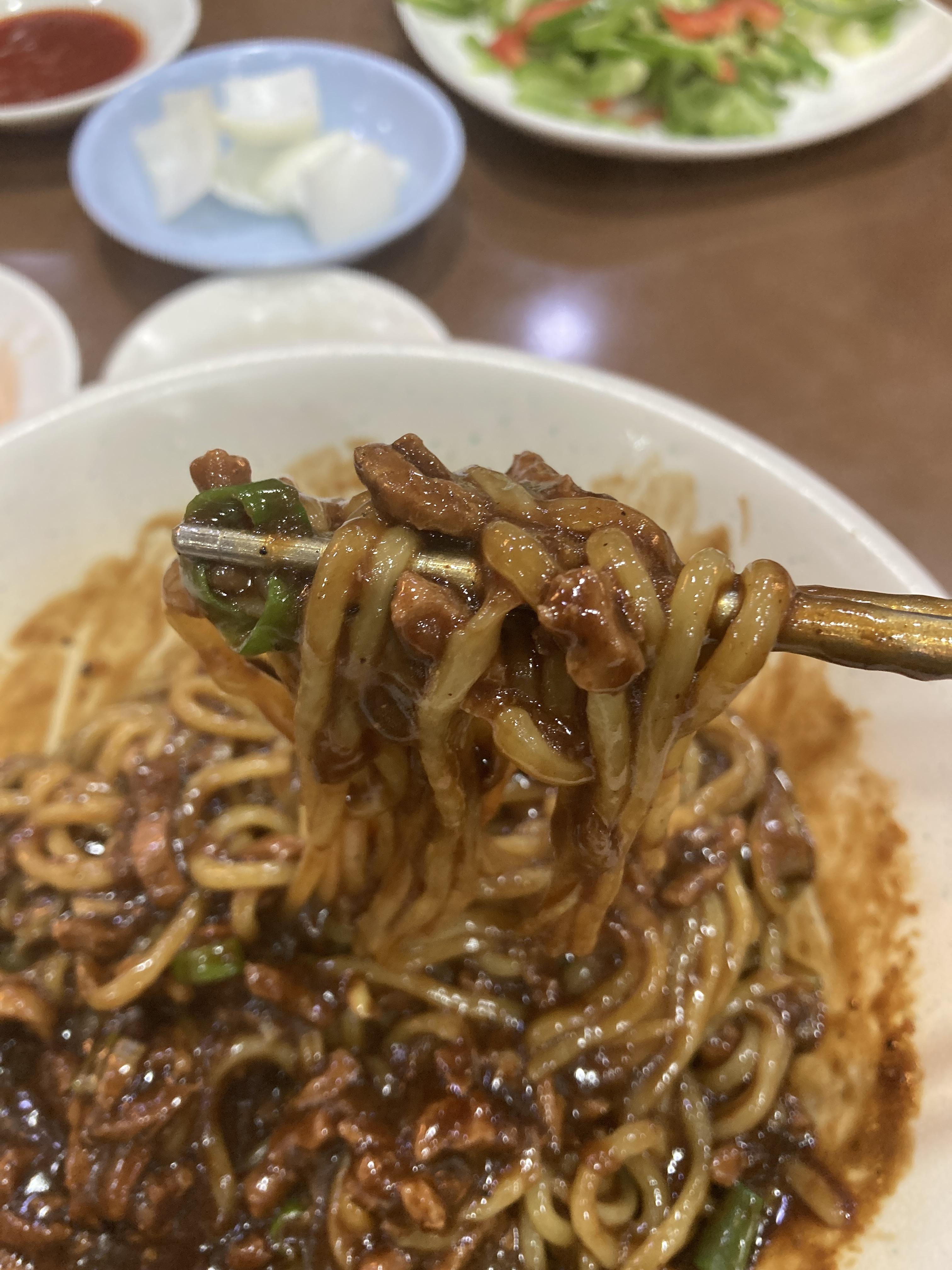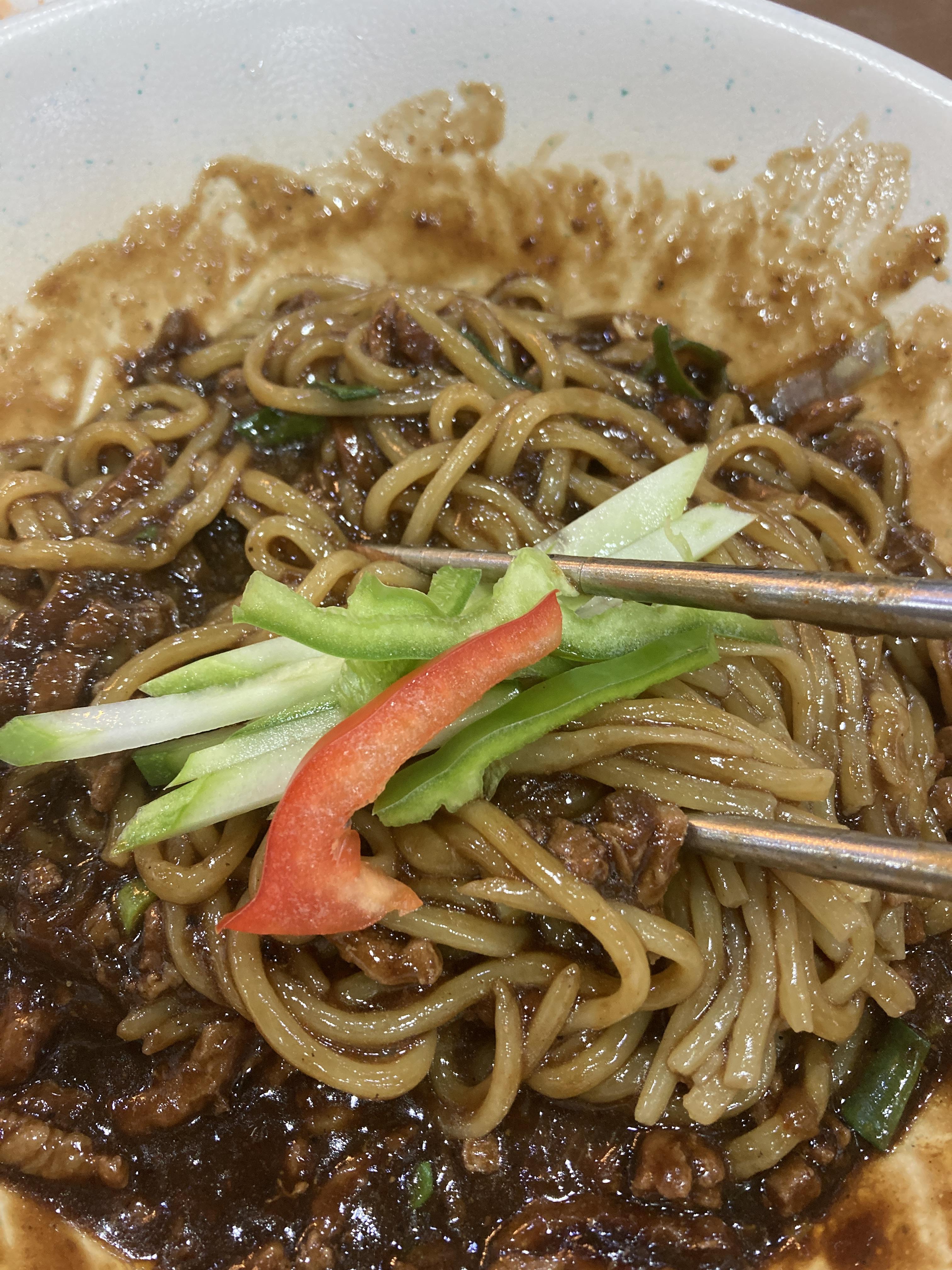 오이와 피망을 곁들여 먹으니 채소들의 아삭한 식감을 느낄 수 있으며, 짜장의 느끼함을 잘 잡아줬습니다.