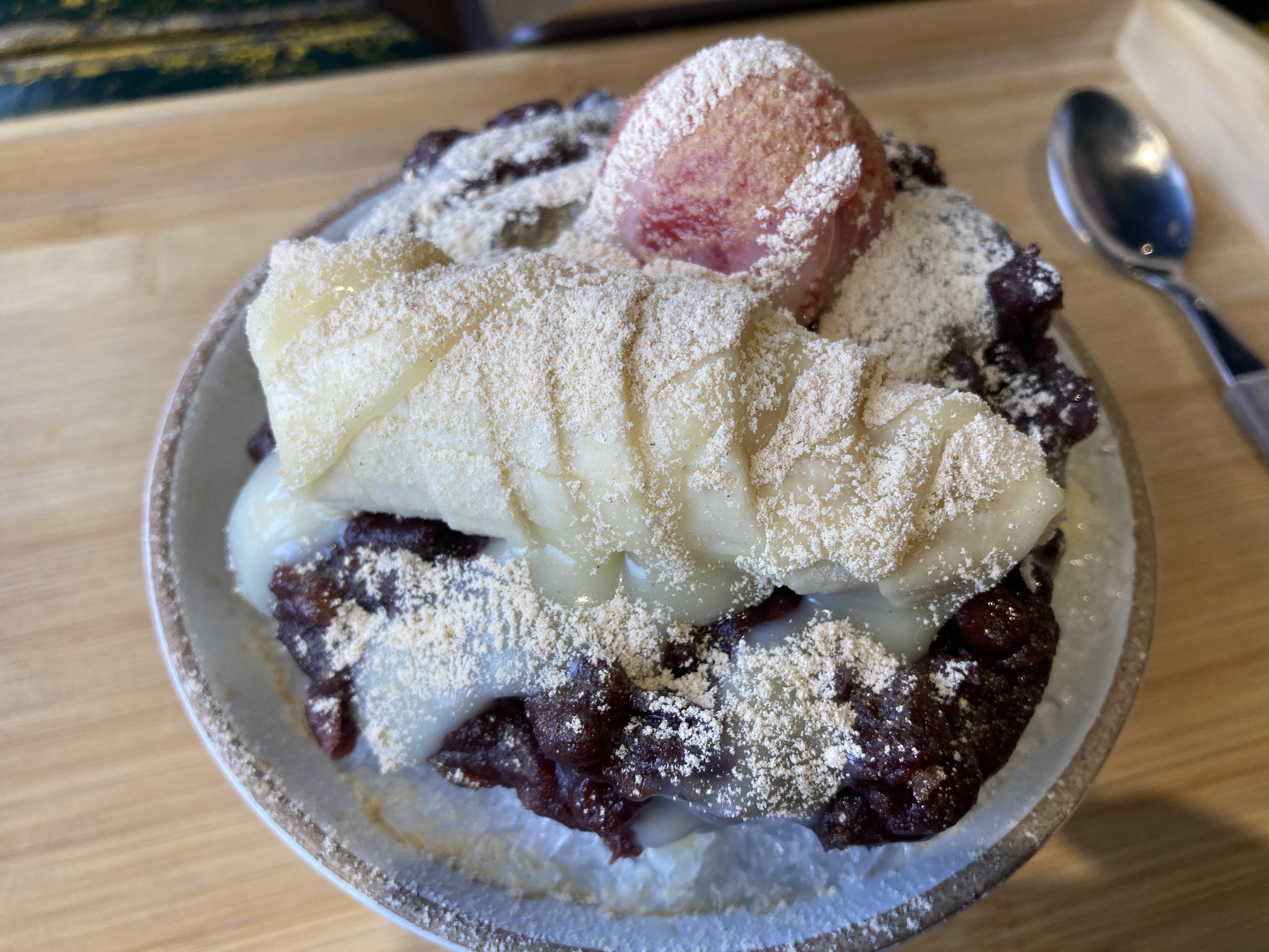 옛날 팥빙수에 과일이 올려져 있는 것은 신선하고 좋았으나 거칠게 갈린 얼음이 우유얼음이 아닌 일반 얼음이라 조금 많이 아쉬웠습니다.